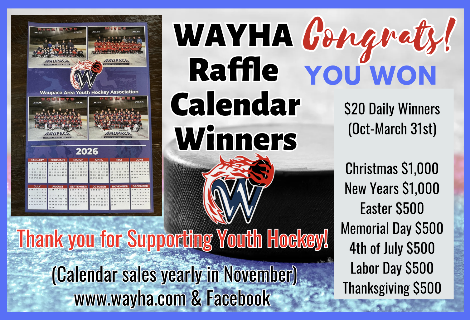 Winners are posted on Facebook at "WAYHA Waupaca Area Youth Hockey Association" monthly.